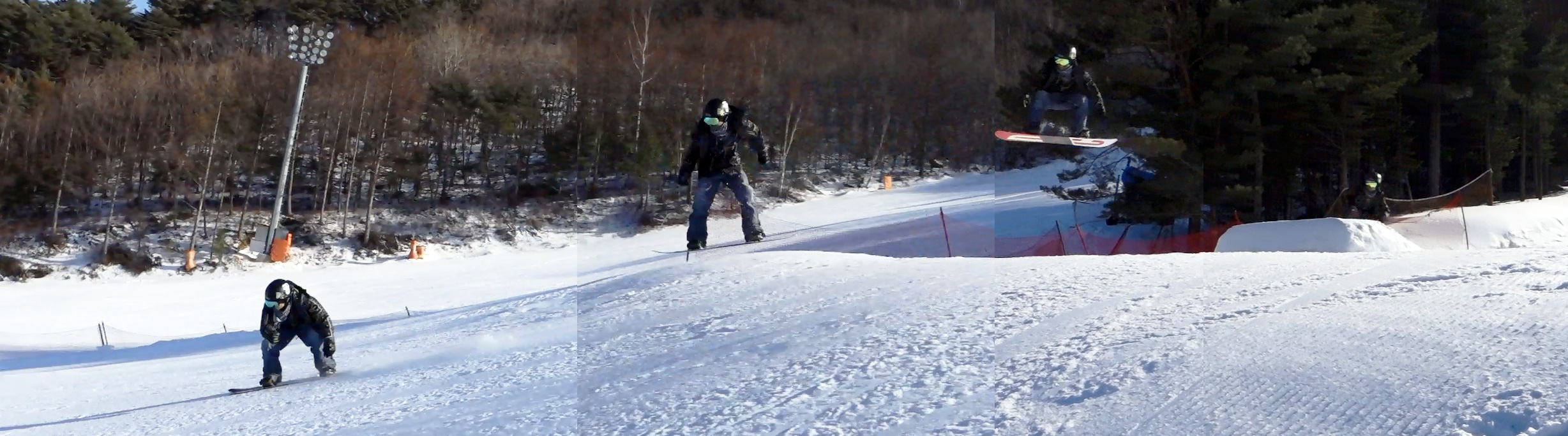 在初學階段,可選擇一個細跳台,什麼動作也不做,只蹲下上身,讓自己慢慢安全地滑過 Kicker 面,初次感受一下"跳"跳台的感覺。